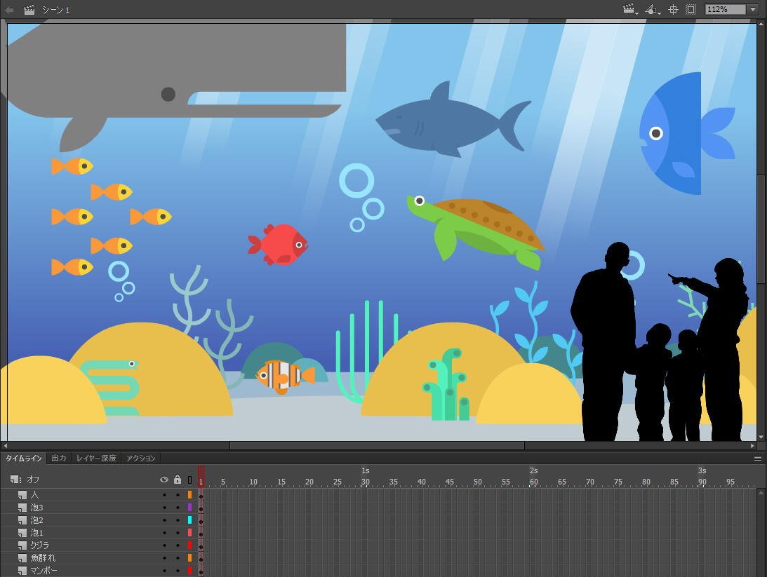 水族館のグラフィックを作ります。この時、お魚、人、背景等を別々のレイヤーに配置するようにします。